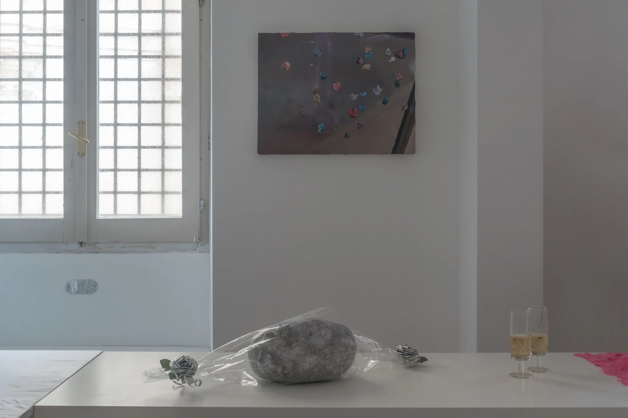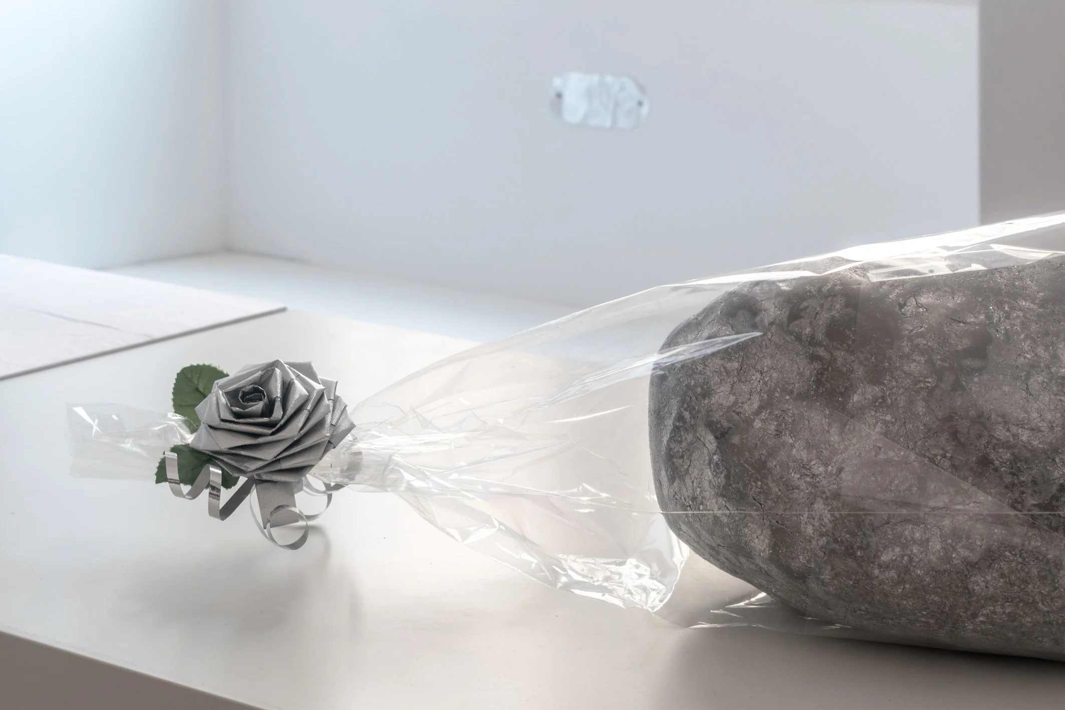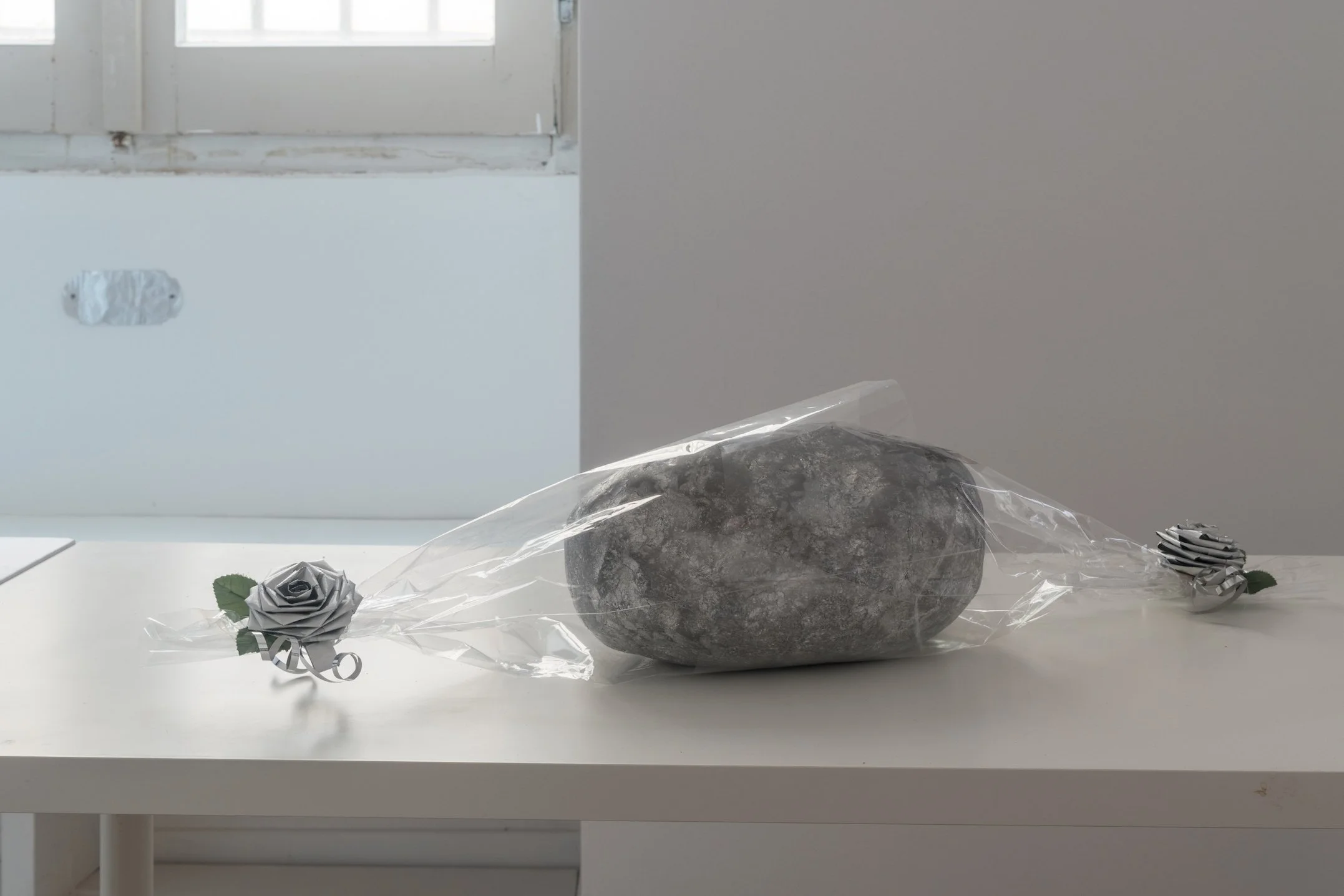 Artists Graham Wiebe and Ella Rose Flood engage the unspoken rules and expectations, the unseen spaces and gestures, and the disused and discarded materials of the dinner party. Wiebe’s sculptural work, Forever, takes the form of an oversized inspirational stone tucked gently between two cellophane bouquet sleeves. The stone’s intended purpose of soothing anxiety is upended by its enlarged scale and dislocation, as it shifts from a secretive and insular act of fumbling taking place in a nervous guest’s pocket to a shining centerpiece on display for the entire table. The compressed aluminum foil of the stone and its repurposed cellophane enclosures make use of materials that often show up to a party serving important symbolic and practical roles, but likely end the night in the trash can or recycling bin. The stone’s inscribed text amplifies the uneasy feelings it was once intended to comfort and transforms the object into a sort of memorial that will long outlast the evening. Wiebe’s second work, Untitled, takes on a similar commemorative purpose and echoes both memorial plaques and place cards arranged around a table. A tension arises through his decision to leave the foil plaque blank, denoting a spot in which no specific person is meant to sit. However, the work’s placement upon a window bench also creates an opportunity for intimate engagement and sharing of space between guests.